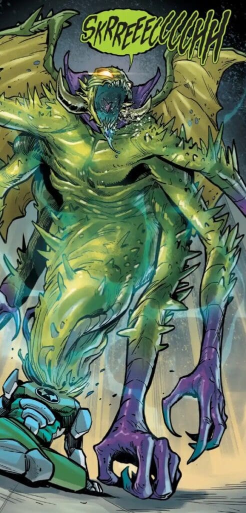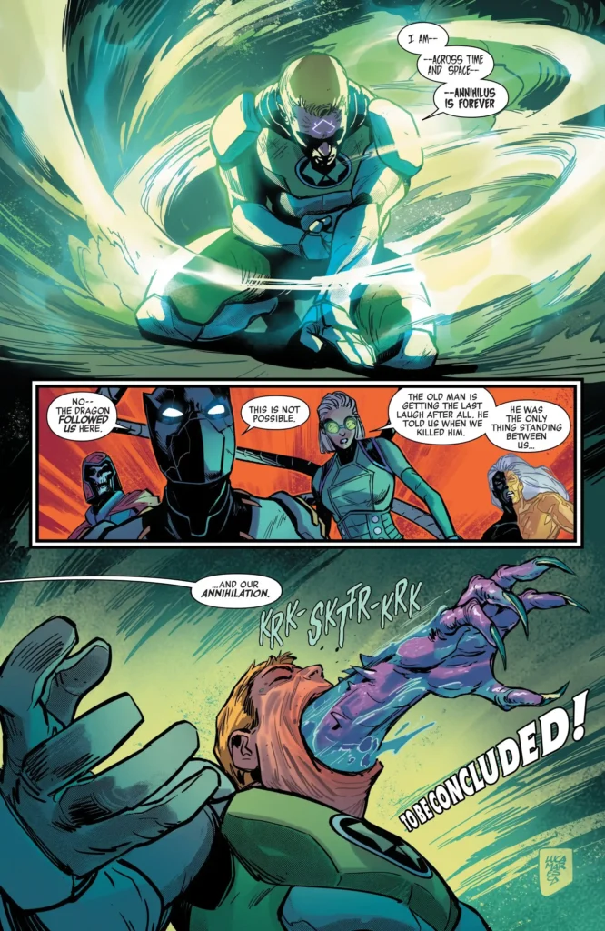 Unbeknownst to the Superior Avengers, they had brought the Annhilus Wave with them from the future. The muscle of the team, Abomination, had been possessed by Annhilus during a mission. Now, just before they sent the Arcane Warhead to the future to stop the invasion of their world, Annhilus revealed himself from within their teammate Abomination.