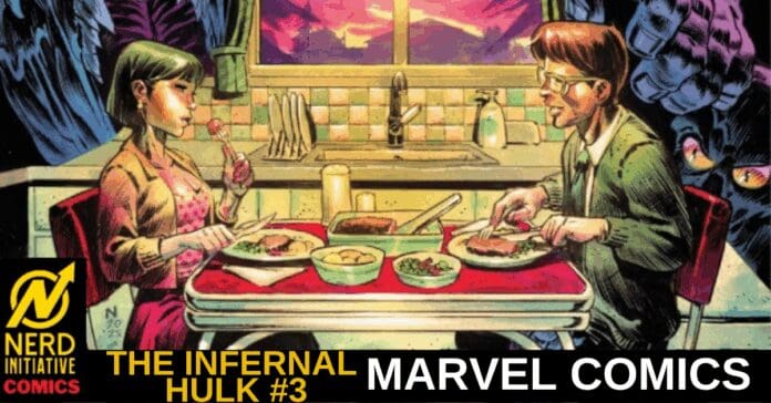 So far, we’ve seen the devastation and the motivations of Eldest, who is now the Infernal Hulk, but what about Bruce? According to the prior issues, Bruce has disappeared with no chance at finding him, which is exactly the way Bruce wants it. Hiding out in Indiana with the love of his life, Betty, Bruce was sure he had it figured out. Creating an entirely new identity, him and Betty are working a normal job under new names and have new friends who know nothing about their past lives. Doing this can ensure that both Bruce and Betty are the safest they possibly can be and could potentially move on from the Hulk era of their lives.